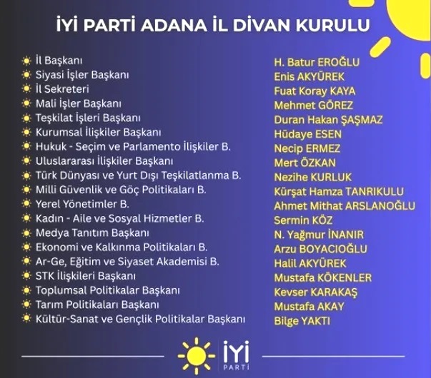 İYİ Parti Adana İl Başkanı Hasan Batur Eroğlu’nun paylaştığı listeye göre divanda görev alan isimler şu şekilde; Siyasi İşler Başkanı Enis Akyürek, İl Sekreteri Fuat Koray Kaya, Mali İşler Başkanı Mehmet Görez, Teşkilaat İşleri Başkanı Duran Hakan Şaşmaz, Kurumsal İşler Başkanı Hüdaye Esen, Hukuk- Seçim ve Parlemento İlişkiler Başkanı Necip Ermez, Uluslararası İlişkiler Başkanı Mert Özkan, Türk Dünyası ve Yurt Dışı Teşkilatlanma Başkanı Nezihe Kurluk, Milli Güvenlik ve Göç Politikaları Başkanı Kürşat Hamza Tanrıkulu, Yerel Yöetimler Başkanı Ahmet Mithat Arslanoğlu,Kadın- Aile ve Sosyal Hizmetler Başkanı Sermin Köz, Medya Tanıtım Başkanı N. Yağmur İnanır, Ekonomi ve Kalkınma Politikaları Başkanı Arzu Boyacıoğlu, Ar-Ge, Eğitim ve Siyaset Akademisi Başkanı Halil Akyürek, STK İlişkileri Başkanı Mustafa Kökenler, Toplumsal Politikalar Başkanı Kevser Karakaş, Tarım Politikaları Başkanı Mustafa Akay ve Kültür-Sanat ve Gençlik Politikaları Başkanı Bilge Yaktı